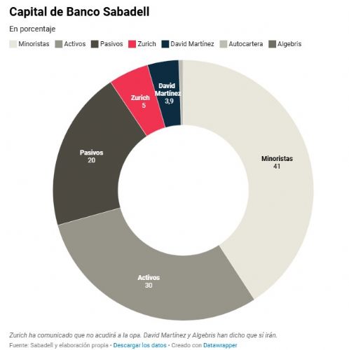 Los inversores institucionales tienen en torno al 35% del capital de Banco Sabadell, según trasladó al mercado el banco catalán después de que el consejo volviera a recomendar rechazar la oferta, tras la mejora del 10% por parte de BBVA. En aquel consejo se desmarcó el consejero David Martínez, inversor mexicano que cuenta con el 3,9% y que dijo que sí irá a la opa. Por su parte, el 40% está en manos de minoristas, un 20% son inversores pasivos y el 5% es de Zurich, que no irá a la opa.