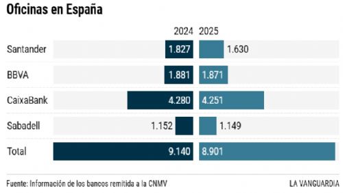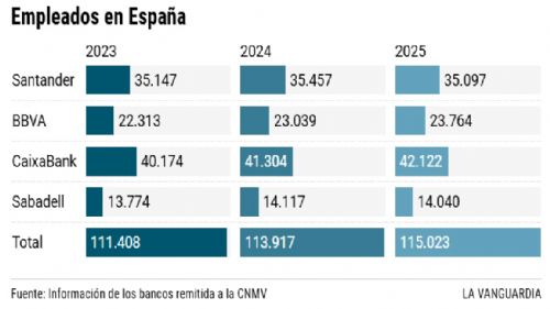 Por ahora los bancos no están recortando plantilla pese a su nueva orientación tecnológica. Al revés, informan de vez en cuando de contrataciones de nuevos perfiles muy diferentes a los tradicionales. Ahora quieren matemáticos, ingenieros, analistas de datos, especialistas en ciberseguridad y, por supuesto, expertos en IA. En el 2025, las principales entidades elevaron sus plantillas en España por segundo ejercicio consecutivo y consolidaron una fuerza laboral que venía cayendo año a año desde el 2014. Siguen cerrando oficinas, pero eso ya no significa que sobren empleados.