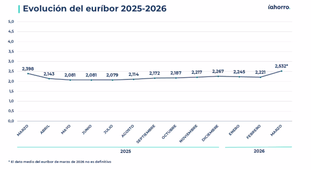 El catalizador responsable de este cambio de tendencia ha sido el ataque de Estados Unidos e Israel a Irán, que ha disparado el precio de los combustibles y, a su ritmo, la inflación. Para atajarla, el Banco Central Europeo (BCE) puede verse forzado a subir los tipos de interés. Una subida que ya ha anticipado el euríbor hasta situarse, a falta de dos datos diarios para cerrar marzo, en el 2,532%, el valor medio mensual más alto registrado desde octubre de 2024.